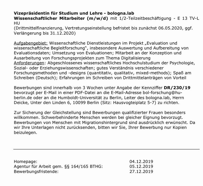 Das bologna.lab der Humboldt-Universität zu Berlin sucht zu Anfang 2020 Verstärkung im Bereich Begleitforschung/Digitalisierung. Wir sind ein Qualitätspakt Lehre Projekt mit den derzeitigen Arbeitsschwerpunkten Forschendes Lernen, Interdisziplinarität, Internationalisierung und Flexibilisierung der Lehre (gerade im Bachelor Bereich) und möchten die Entscheidung zweier Kolleginnen für Nachwuchsförderung der anderen Art nutzen, um unsere Schwerpunkte neu zu sortieren. Schwerpunkt dieser Stelle wäre vor allem die Fortführung unserer Projektevaluation. Interesse und Mitwirkung an weiteren Förder/Forschungsanträgen ist – mit Blick auf das Auslaufen des Qualitätspakts Ende 2020 – ausdrücklich erwünscht.