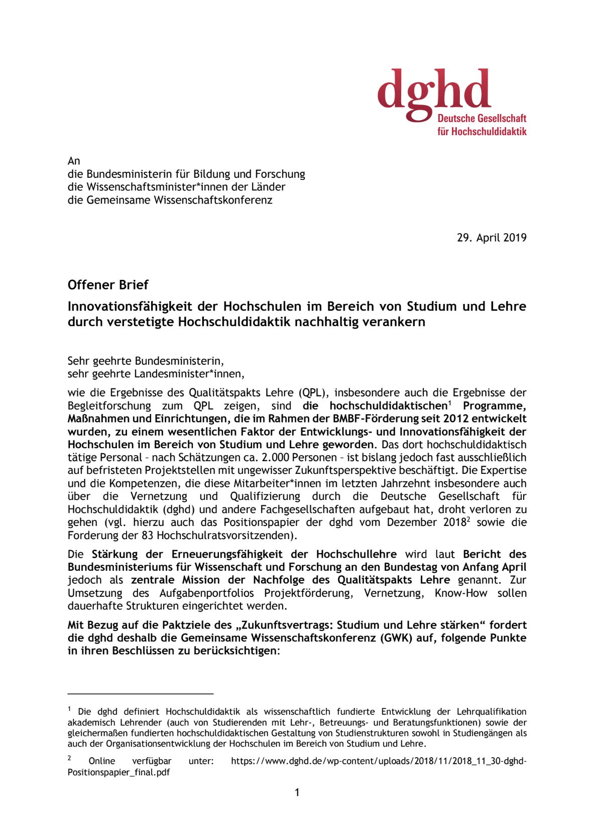 Offener Brief – Innovationsfähigkeit der Hochschulen im Bereich von Studium und Lehre durch verstetigte Hochschuldidaktik nachhaltig verankern
