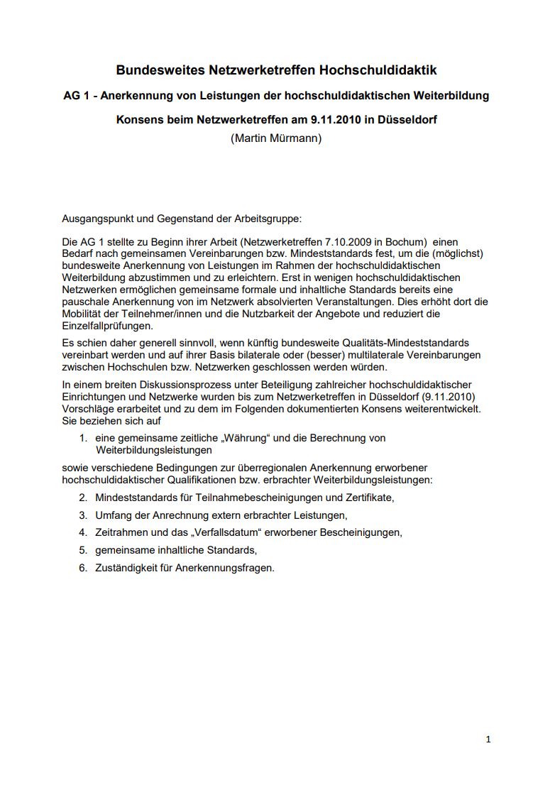Die AG 1 stellte zu Beginn ihrer Arbeit (Netzwerketreffen 7.10.2009 in Bochum) einen Bedarf nach gemeinsamen Vereinbarungen bzw. Mindeststandards fest, um die (möglichst) bundesweite Anerkennung von Leistungen im Rahmen der hochschuldidaktischen Weiterbildung abzustimmen und zu erleichtern. Erst in wenigen hochschuldidaktischen Netzwerken ermöglichen gemeinsame formale und inhaltliche Standards bereits eine pauschale Anerkennung von im Netzwerk absolvierten Veranstaltungen. Dies erhöht dort die Mobilität der Teilnehmer/innen und die Nutzbarkeit der Angebote und reduziert die Einzelfallprüfungen.