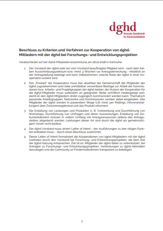 Beschluss zu Kriterien und Verfahren zur Kooperation von dghd-Mitgliedern mit der dghd bei Forschungs- und Entwicklungsprojekten. Verabschiedet auf der dghd-Mitgliederversammlung am 28.02.2018 in Karlsruhe.