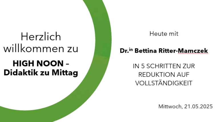 High Noon – Didaktik zu Mittag ist eine interaktive Online-Vortragsreihe des Zentrums für Lehrkompetenz der Uni Graz. Im Rahmen der Vorträge wird die ganzen Breite der Hochschuldidaktik mit allen Handlungs- bzw. Gestaltungsebenen adressiert: von der Lehrhaltung über die Lehr- und Lernsituationen im Labor/Seminarraum/Vorlesungssaal bis hin zu organisationalen Rahmenbedingungen tertiärer Bildung. Alles hat Platz: konkrete Methoden, didaktische Prinzipien und Modelle, bildungswissenschaftliche Konzepte, Überlegungen zu Kommunikation und Beziehungsgestaltung, Forschungsergebnisse, prüfungsdidaktisches Wissen u.v.m.