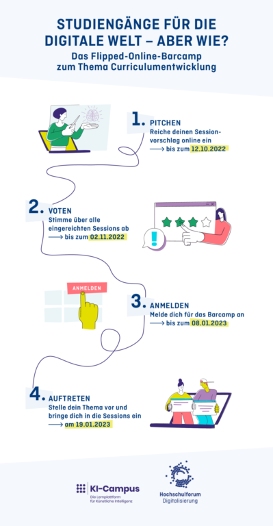 Am 19. Januar 2023 laden das Hochschulforum Digitalisierung (HFD) und der KI-Campus zu einem Flipped-Online-Barcamp zur Curriculumentwicklung ein. Im Fokus steht die Frage nach der nachhaltigen Implementierung von Digital- und KI-Kompetenzen im Studium. Alle Infos unter https://hochschulforumdigitalisierung.de/curriculum-barcamp