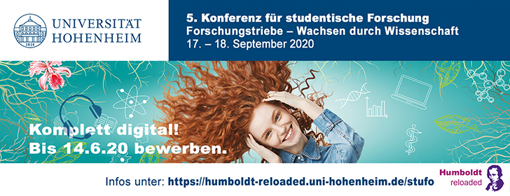 Noch bis zum 14.6. habt Ihr die Möglichkeit Euch für einen Vortrag bei der 5. Konferenz für studentische Forschung (StuFo2020) zu bewerben.